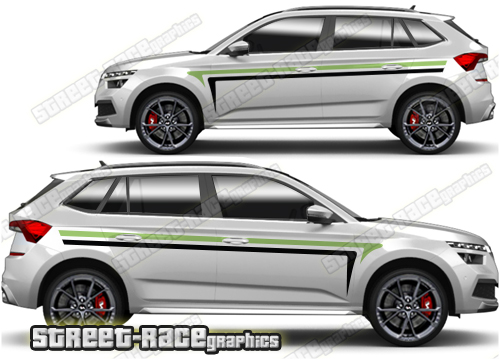 Skoda Kamiq graphics. They are shown on the first generation Kamiq but they can be trimmed to fit all later versions and facelift variants. The decals are not pre-cut for any specific Skoda Kamiq version; they do not have any door handle cutouts, wheel arch or door line splits. These will require trimming during fitting. Vinyl will not stick to unpainted textured plastics.
