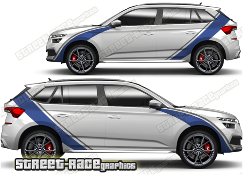 Skoda Kamiq graphics. They are shown on the first generation Kamiq but they can be trimmed to fit all later versions and facelift variants. The decals are not pre-cut for any specific Skoda Kamiq version; they do not have any door handle cutouts, wheel arch or door line splits. These will require trimming during fitting. Vinyl will not stick to unpainted textured plastics.