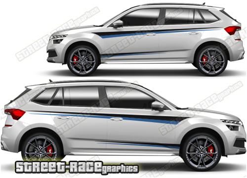Skoda Kamiq graphics. They are shown on the first generation Kamiq but they can be trimmed to fit all later versions and facelift variants. The decals are not pre-cut for any specific Skoda Kamiq version; they do not have any door handle cutouts, wheel arch or door line splits. These will require trimming during fitting. Vinyl will not stick to unpainted textured plastics.