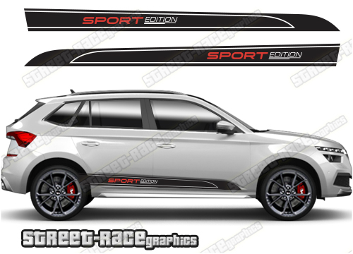 Skoda Kamiq racing stripes. They are shown on the first generation Kamiq but they can be trimmed to fit all later versions and facelift variants. The decals are not pre-cut for any specific Skoda Kamiq version; they do not have any door handle cutouts, wheel arch or door line splits. These will require trimming during fitting. Vinyl will not stick to unpainted textured plastics.