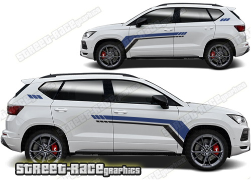 Skoda Karoq graphics. They are shown on the first generation Karoq but they can be trimmed to fit all later versions and facelift variants. The decals are not pre-cut for any specific Skoda Karoq version; they do not have any door handle cutouts, wheel arch or door line splits. These will require trimming during fitting. Vinyl will not stick to unpainted textured plastics.