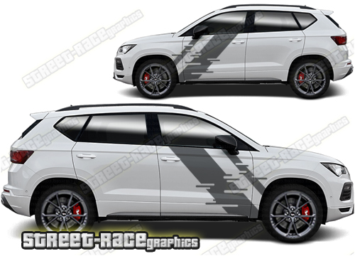 Skoda Karoq graphics. They are shown on the first generation Karoq but they can be trimmed to fit all later versions and facelift variants. The decals are not pre-cut for any specific Skoda Karoq version; they do not have any door handle cutouts, wheel arch or door line splits. These will require trimming during fitting. Vinyl will not stick to unpainted textured plastics.