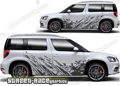 Skoda Yeti graphics. They are shown on the first generation Yeti but they can be trimmed to fit all later versions and facelift variants. The decals are not pre-cut for any specific Skoda Yeti version; they do not have any door handle cutouts, wheel arch or door line splits. These will require trimming during fitting. Vinyl will not stick to unpainted textured plastics.