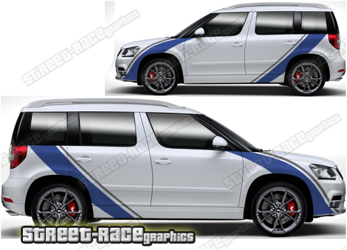 Skoda Yeti graphics. They are shown on the first generation Yeti but they can be trimmed to fit all later versions and facelift variants. The decals are not pre-cut for any specific Skoda Yeti version; they do not have any door handle cutouts, wheel arch or door line splits. These will require trimming during fitting. Vinyl will not stick to unpainted textured plastics.