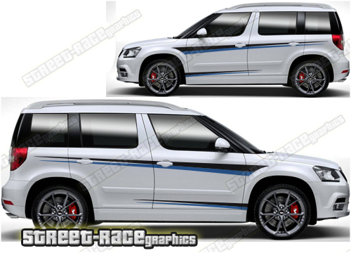 Skoda Yeti graphics. They are shown on the first generation Yeti but they can be trimmed to fit all later versions and facelift variants. The decals are not pre-cut for any specific Skoda Yeti version; they do not have any door handle cutouts, wheel arch or door line splits. These will require trimming during fitting. Vinyl will not stick to unpainted textured plastics.