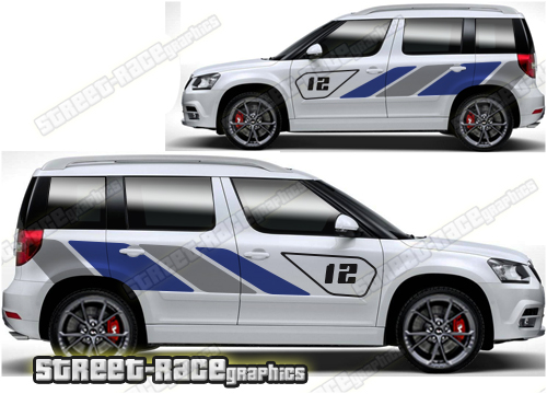 Skoda Yeti graphics. They are shown on the first generation Yeti but they can be trimmed to fit all later versions and facelift variants. The decals are not pre-cut for any specific Skoda Yeti version; they do not have any door handle cutouts, wheel arch or door line splits. These will require trimming during fitting. Vinyl will not stick to unpainted textured plastics.