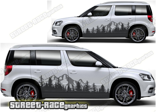 Skoda Yeti graphics. They are shown on the first generation Yeti but they can be trimmed to fit all later versions and facelift variants. The decals are not pre-cut for any specific Skoda Yeti version; they do not have any door handle cutouts, wheel arch or door line splits. These will require trimming during fitting. Vinyl will not stick to unpainted textured plastics.