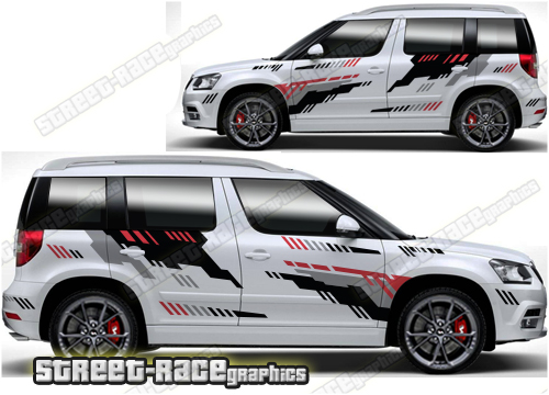 Skoda Yeti graphics. They are shown on the first generation Yeti but they can be trimmed to fit all later versions and facelift variants. The decals are not pre-cut for any specific Skoda Yeti version; they do not have any door handle cutouts, wheel arch or door line splits. These will require trimming during fitting. Vinyl will not stick to unpainted textured plastics.