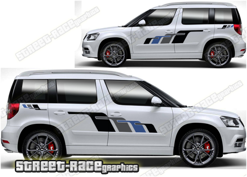 Skoda Yeti graphics. They are shown on the first generation Yeti but they can be trimmed to fit all later versions and facelift variants. The decals are not pre-cut for any specific Skoda Yeti version; they do not have any door handle cutouts, wheel arch or door line splits. These will require trimming during fitting. Vinyl will not stick to unpainted textured plastics.