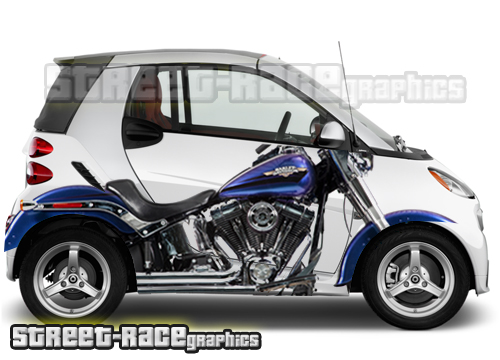Digitally printed and contour cut Smart Fortwo Harley Davidson motorbike side part-wrap graphics, they can be trimmed to fit all ForTwo cars and facelift variants.