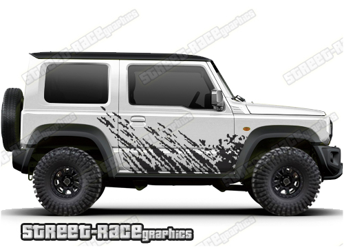 Suzuki Jimny graphics. They are shown on the fourth generation Suzuki Jimny but they can be trimmed to fit the MK2 and MK3. The decals are not pre-cut for any specific Jimny version; they do not have any cut-outs for the door handles, wheel arches or door line splits. These will require trimming during fitting.