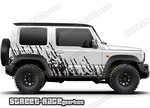 Suzuki Jimny graphics. They are shown on the fourth generation Suzuki Jimny but they can be trimmed to fit the MK2 and MK3. The decals are not pre-cut for any specific Jimny version; they do not have any cut-outs for the door handles, wheel arches or door line splits. These will require trimming during fitting.
