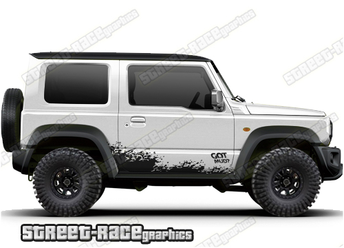 Suzuki Jimny graphics. They are shown on the fourth generation Suzuki Jimny but they can be trimmed to fit the MK2 and MK3. The decals are not pre-cut for any specific Jimny version; they do not have any cut-outs for the door handles, wheel arches or door line splits. These will require trimming during fitting.