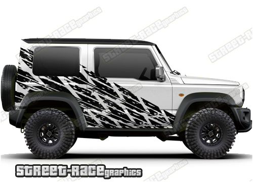 Suzuki Jimny graphics. They are shown on the fourth generation Suzuki Jimny but they can be trimmed to fit the MK2 and MK3. The decals are not pre-cut for any specific Jimny version; they do not have any cut-outs for the door handles, wheel arches or door line splits. These will require trimming during fitting.