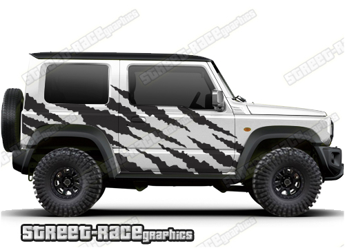 Suzuki Jimny graphics. They are shown on the fourth generation Suzuki Jimny but they can be trimmed to fit the MK2 and MK3. The decals are not pre-cut for any specific Jimny version; they do not have any cut-outs for the door handles, wheel arches or door line splits. These will require trimming during fitting.