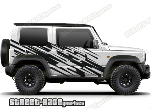 Suzuki Jimny graphics. They are shown on the fourth generation Suzuki Jimny but they can be trimmed to fit the MK2 and MK3. The decals are not pre-cut for any specific Jimny version; they do not have any cut-outs for the door handles, wheel arches or door line splits. These will require trimming during fitting.