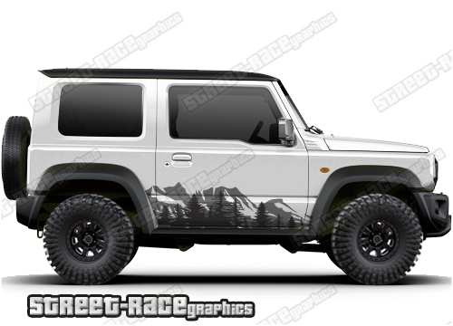 Suzuki Jimny graphics. They are shown on the fourth generation Suzuki Jimny but they can be trimmed to fit the MK2 and MK3. The decals are not pre-cut for any specific Jimny version; they do not have any cut-outs for the door handles, wheel arches or door line splits. These will require trimming during fitting.