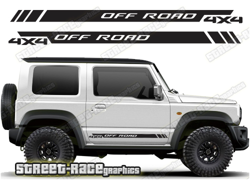 Suzuki Jimny racing stripes. They are shown on the fourth generation Suzuki Jimny but they can be trimmed to fit the MK2 and MK3. The decals are not pre-cut for any specific Jimny version; they do not have any cut-outs for the wheel arches or door line splits. These will require trimming during fitting.