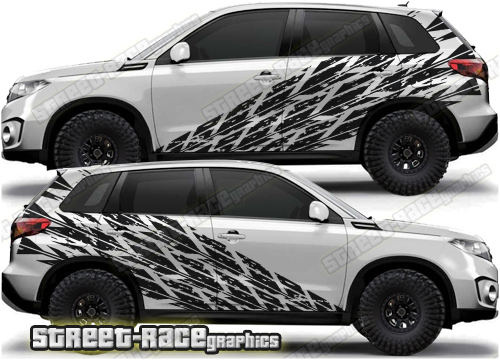 Suzuki Vitara graphics (Also known as Grand Vitara). They are shown on the fourth generation Vitara but they can be trimmed to fit the MK3. The decals are not pre-cut for any specific Vitara version; they do not have any door handle cutouts, wheel arch or door line splits. These will require trimming during fitting. Vinyl will not stick to unpainted textured plastic, so the graphics are not suitable for the first or second generation Vitara.