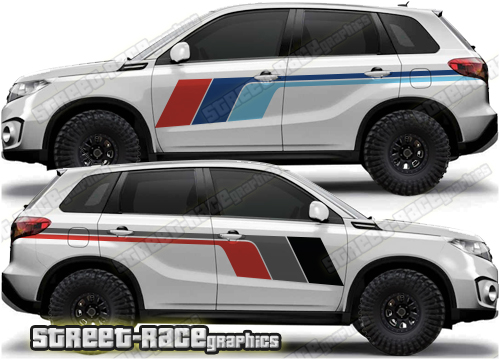 Suzuki Vitara graphics (Also known as Grand Vitara). They are shown on the fourth generation Vitara but they can be trimmed to fit the MK3. The decals are not pre-cut for any specific Vitara version; they do not have any door handle cutouts, wheel arch or door line splits. These will require trimming during fitting. Vinyl will not stick to unpainted textured plastic, so the graphics are not suitable for the first or second generation Vitara.