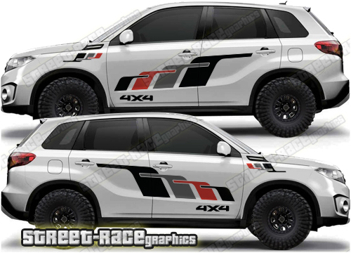 Suzuki Vitara graphics (Also known as Grand Vitara). They are shown on the fourth generation Vitara but they can be trimmed to fit the MK3. The decals are not pre-cut for any specific Vitara version; they do not have any door handle cutouts, wheel arch or door line splits. These will require trimming during fitting. Vinyl will not stick to unpainted textured plastic, so the graphics are not suitable for the first or second generation Vitara.