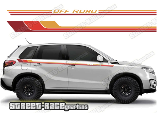 Suzuki Vitara graphics (Also known as Grand Vitara). They are shown on the fourth generation Vitara but they can be trimmed to fit the MK3. The decals are not pre-cut for any specific Vitara version; they do not have any door handle cutouts, wheel arch or door line splits. These will require trimming during fitting. Vinyl will not stick to unpainted textured plastic, so the graphics are not suitable for the first or second generation Vitara.
