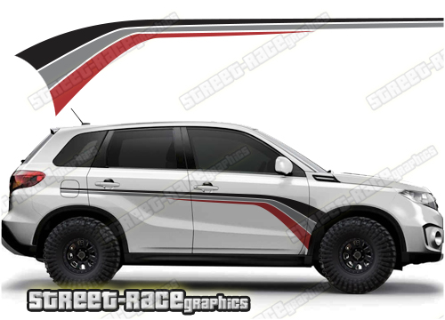 Suzuki Vitara graphics (Also known as Grand Vitara). They are shown on the fourth generation Vitara but they can be trimmed to fit the MK3. The decals are not pre-cut for any specific Vitara version; they do not have any door handle cutouts, wheel arch or door line splits. These will require trimming during fitting. Vinyl will not stick to unpainted textured plastic, so the graphics are not suitable for the first or second generation Vitara.