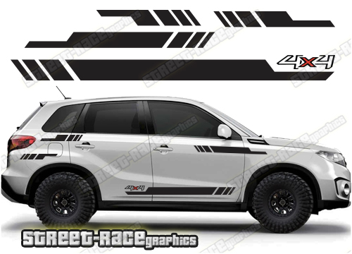 Suzuki Vitara graphics (Also known as Grand Vitara). They are shown on the fourth generation Vitara but they can be trimmed to fit the MK3. The decals are not pre-cut for any specific Vitara version; they do not have any door handle cutouts, wheel arch or door line splits. These will require trimming during fitting. Vinyl will not stick to unpainted textured plastic, so the graphics are not suitable for the first or second generation Vitara.