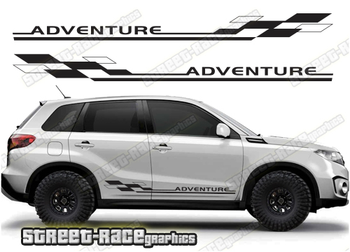 Suzuki Vitara graphics (Also known as Grand Vitara). They are shown on the fourth generation Vitara but they can be trimmed to fit the MK3. The decals are not pre-cut for any specific Vitara version; they do not have any door handle cutouts, wheel arch or door line splits. These will require trimming during fitting. Vinyl will not stick to unpainted textured plastic, so the graphics are not suitable for the first or second generation Vitara.