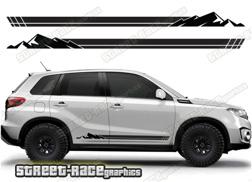 Suzuki Vitara graphics (Also known as Grand Vitara). They are shown on the fourth generation Vitara but they can be trimmed to fit the MK3. The decals are not pre-cut for any specific Vitara version; they do not have any door handle cutouts, wheel arch or door line splits. These will require trimming during fitting. Vinyl will not stick to unpainted textured plastic, so the graphics are not suitable for the first or second generation Vitara.