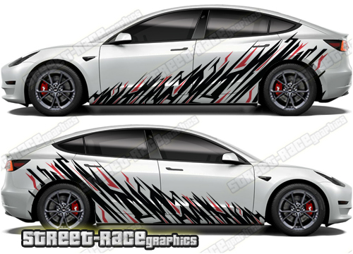 Tesla Model 3 large graphics. They are a universal fit to suit all Tesla Model 3 cars and facelift variants. There are no cutouts for the door handles, wheel arches or door lines; these will require trimming during fitting.