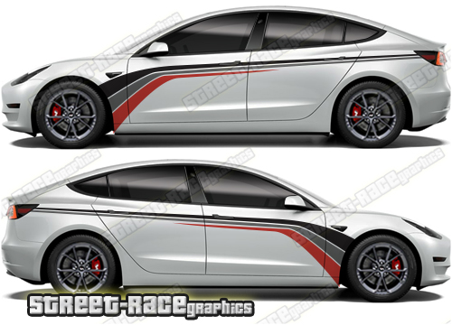 Tesla Model 3 large graphics. They are a universal fit to suit all Tesla Model 3 cars and facelift variants. There are no cutouts for the door handles, wheel arches or door lines; these will require trimming during fitting.