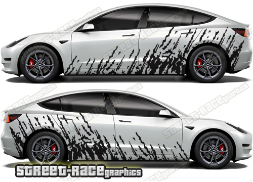 Tesla Model 3 large graphics. They are a universal fit to suit all Tesla Model 3 cars and facelift variants. There are no cutouts for the door handles, wheel arches or door lines; these will require trimming during fitting.