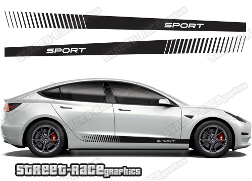 Tesla Model 3 racing stripes. They are a universal fit to suit all Tesla Model 3 cars and facelift variants from MK1 onwards. There are no cutouts for the wheel arches or door lines; these will require trimming during fitting.