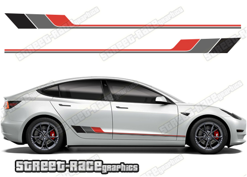 Tesla Model 3 racing stripes. They are a universal fit to suit all Tesla Model 3 cars and facelift variants from MK1 onwards. There are no cutouts for the wheel arches or door lines; these will require trimming during fitting.