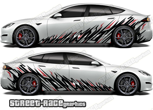 Tesla Model S large graphics. They are a universal fit to suit all Tesla Model S cars and facelift variants. There are no cutouts for the door handles, wheel arches or door lines; these will require trimming during fitting.