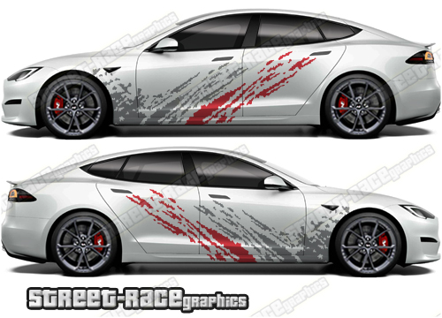 Tesla Model S large graphics. They are a universal fit to suit all Tesla Model S cars and facelift variants. There are no cutouts for the door handles, wheel arches or door lines; these will require trimming during fitting.