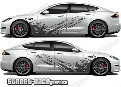 Tesla Model S large graphics. They are a universal fit to suit all Tesla Model S cars and facelift variants. There are no cutouts for the door handles, wheel arches or door lines; these will require trimming during fitting.