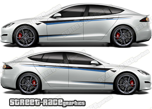 Tesla Model S large graphics. They are a universal fit to suit all Tesla Model S cars and facelift variants. There are no cutouts for the door handles, wheel arches or door lines; these will require trimming during fitting.