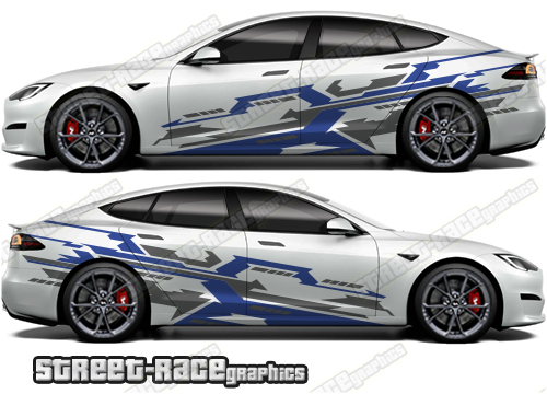 Tesla Model S large graphics. They are a universal fit to suit all Tesla Model S cars and facelift variants. There are no cutouts for the door handles, wheel arches or door lines; these will require trimming during fitting.