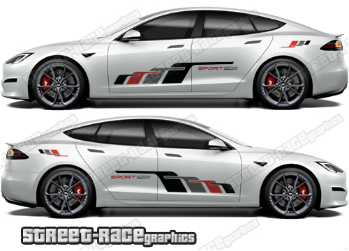 Tesla Model S large graphics. They are a universal fit to suit all Tesla Model S cars and facelift variants. There are no cutouts for the door handles, wheel arches or door lines; these will require trimming during fitting.
