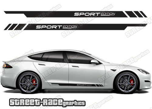 Tesla Model S racing stripes. They are a universal fit to suit all Tesla Model S cars and facelift variants from MK1 onwards. There are no cutouts for the wheel arches or door lines; these will require trimming during fitting.