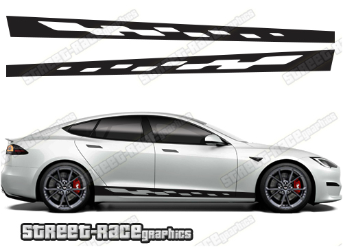 Tesla Model S racing stripes. They are a universal fit to suit all Tesla Model S cars and facelift variants from MK1 onwards. There are no cutouts for the wheel arches or door lines; these will require trimming during fitting.