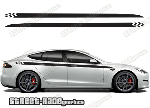 Tesla Model S racing stripes. They are a universal fit to suit all Tesla Model S cars and facelift variants from MK1 onwards. There are no cutouts for the wheel arches or door lines; these will require trimming during fitting.
