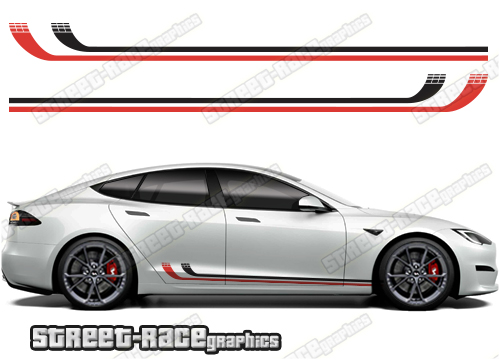 Tesla Model S racing stripes. They are a universal fit to suit all Tesla Model S cars and facelift variants from MK1 onwards. There are no cutouts for the wheel arches or door lines; these will require trimming during fitting.