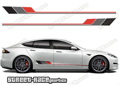 Tesla Model S racing stripes. They are a universal fit to suit all Tesla Model S cars and facelift variants from MK1 onwards. There are no cutouts for the wheel arches or door lines; these will require trimming during fitting.