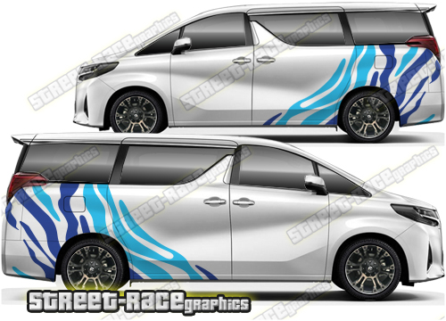 Toyota Alphard graphics. Great for a camper or race van conversion. They are a universal fit to suit all Toyota Alphard vans and facelift variants from MK1 onwards. There are no cutouts for the wheel arches, door handles or door lines, these will require trimming during fitting.
