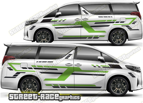 Toyota Alphard graphics. Great for a camper or race van conversion. They are a universal fit to suit all Toyota Alphard vans and facelift variants from MK1 onwards. There are no cutouts for the wheel arches, door handles or door lines, these will require trimming during fitting.