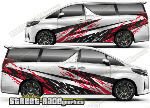 Toyota Alphard graphics. Great for a camper or race van conversion. They are a universal fit to suit all Toyota Alphard vans and facelift variants from MK1 onwards. There are no cutouts for the wheel arches, door handles or door lines, these will require trimming during fitting.