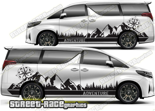 Toyota Alphard graphics. Great for a camper or race van conversion. They are a universal fit to suit all Toyota Alphard vans and facelift variants from MK1 onwards. There are no cutouts for the wheel arches, door handles or door lines, these will require trimming during fitting.